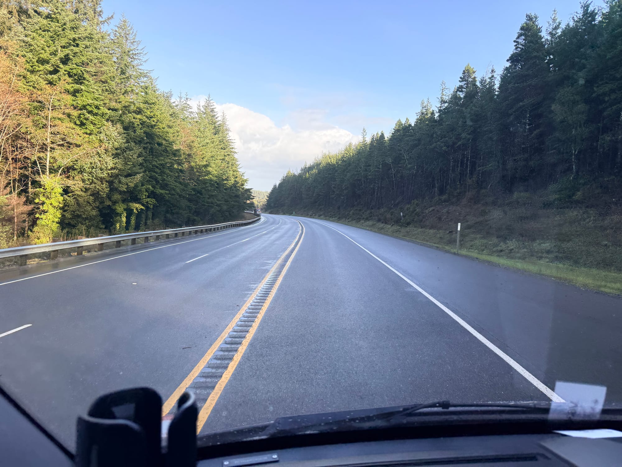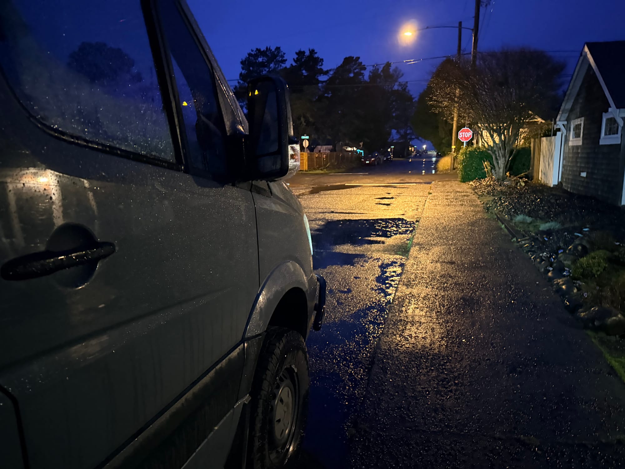 A three-day push north from Eric and Maggies: rainy highways, then blue-sky Oregon coast, a final night in Seaside, and home to Catherine. Van cleaned and ready. Includes trip stats: miles, mpg, best/worst tanks, fuel total.