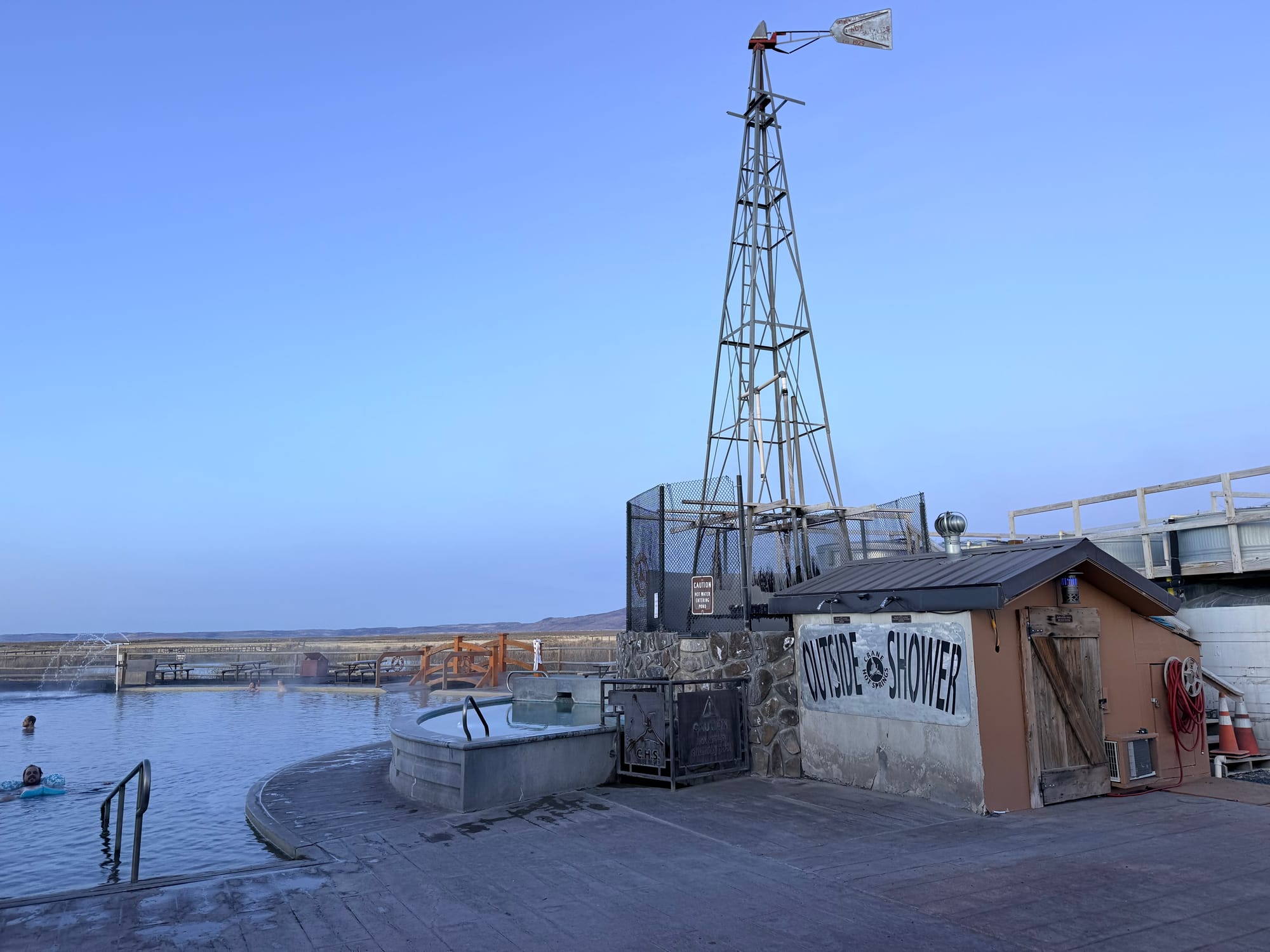 Let me talk about the Crane Hot Springs a bit. The pond is probably 40-50 yards in diameter and has a concrete apron around 50% of it. The bottom is crushed basalt, and the depth ranges from sitting on your butt with your shoulders out of the water at the shallowest, to standing upright on my knees with my shoulders out at the deepest. There are three places where they get hot water into the pond. A big central structure that has the Lobster Pot (where they keep the water at 103-105 degrees) and two more minor spots at 9 o'clock and 2 o'clock if the central area is at 12 o'clock. On either side of the central tower are concrete ramps that feed you into the pond, with grab rails, which are necessary as the algae grows and grows, and the ramps are pretty slippery. The place is open from 7 am to 10 pm every day for checking in, and the pond itself is open 24 hours. All in all, it was quite a pleasant surprise. And quite enjoyed soaking there.