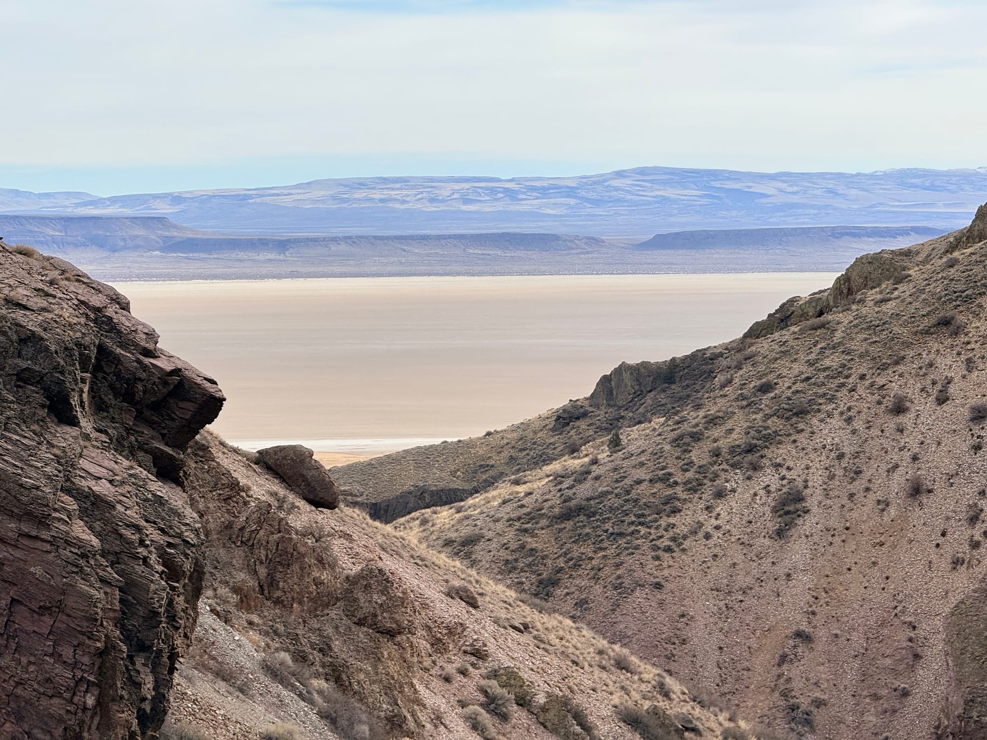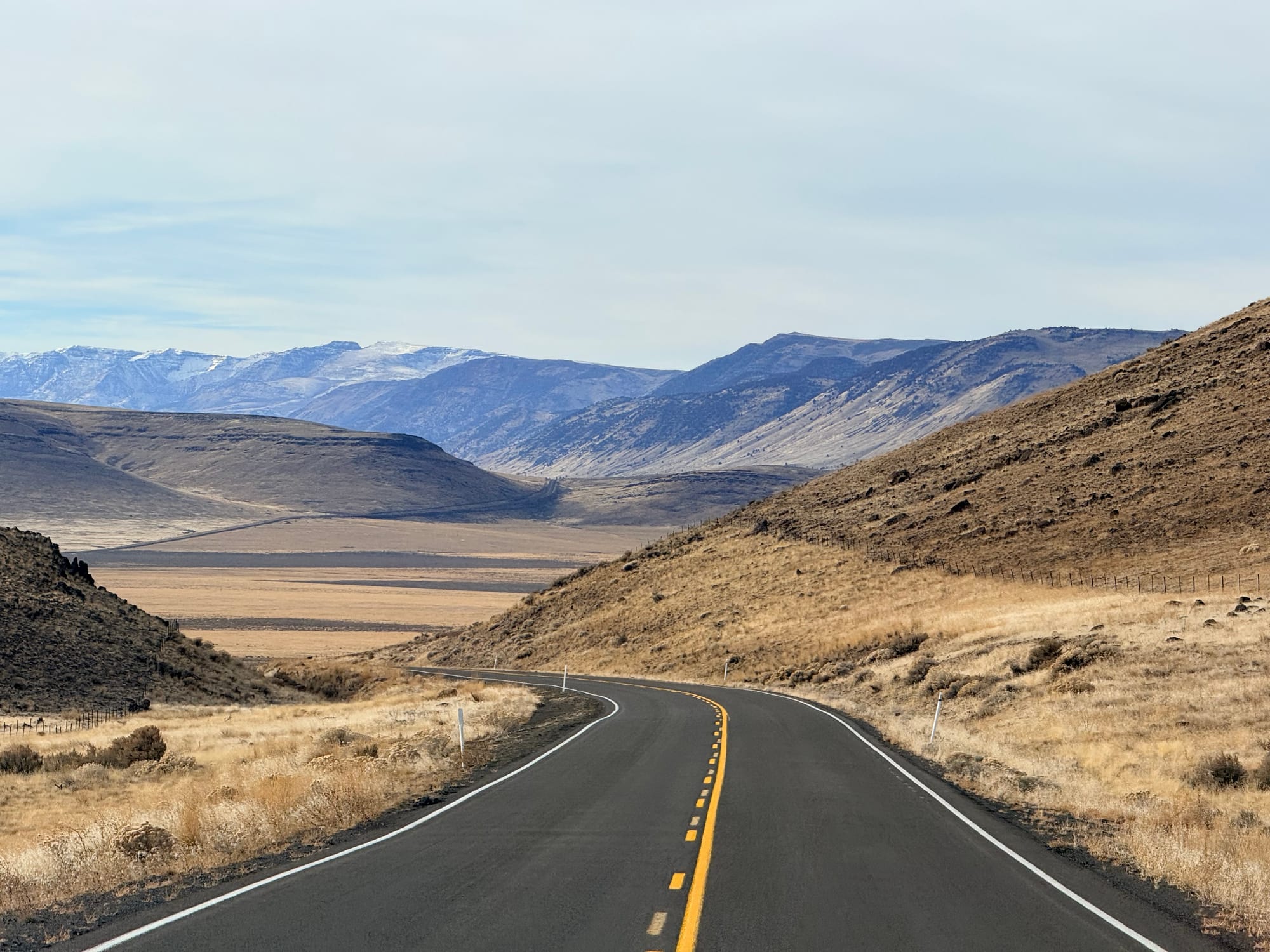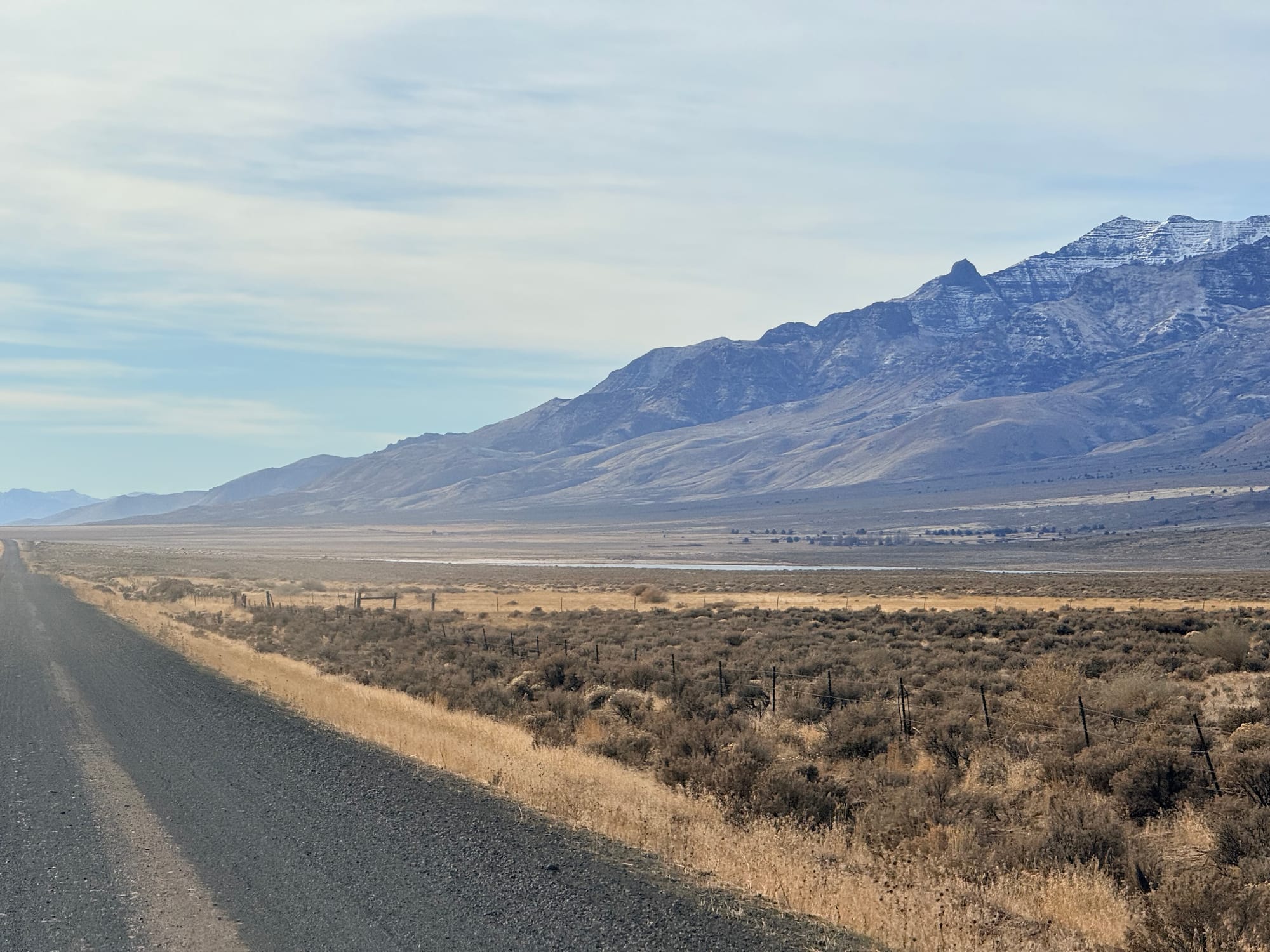 I had made a slight tactical error coming into the hot spring: I drove through Burns without topping off the fuel tank. The implications of this were that I had to travel 20 miles out and 20 miles back to fuel up for the day, as I didn't have enough fuel to make it all the way along the route that I was headed, and there were no fuel stops until beyond the range that I had on board. This has me thinking that I want to get the extended fuel tank installed before we start our 27 trip. So I got fuel at this local place, and headed out towards the Steen Mountains. Since it is winter time, I was not able to drive into the mountains themselves, so instead went along the eastern base of them, next to the Alvord Desert. There was about 28 miles of dirt road, that was pretty well maintained. I switched the suspension to setting one, and it handled it just fine, and I didn't feel too compelled to air down, although I am that would have made the ride a bit more comfortable. The weather was quite nice for the whole drive.