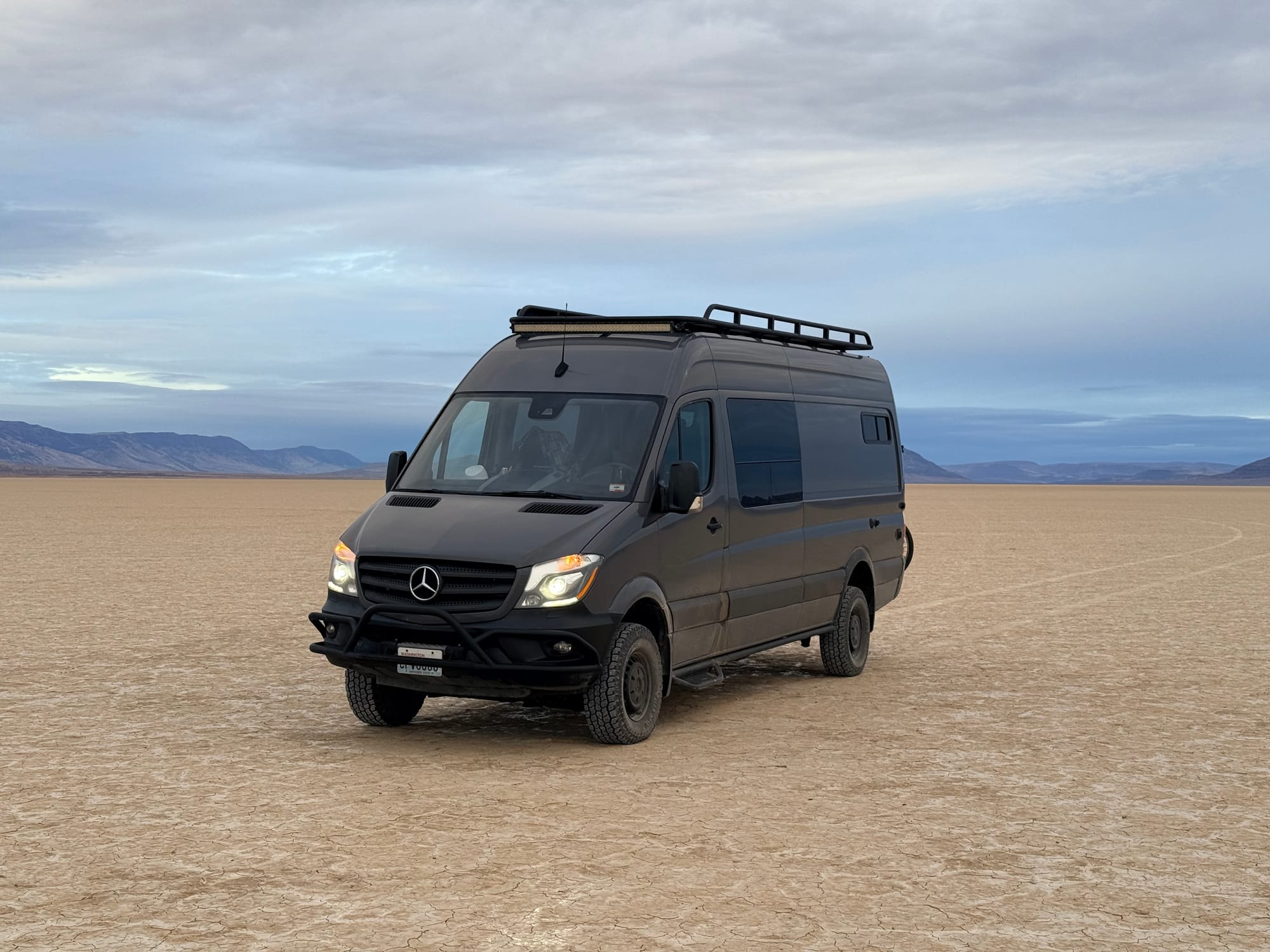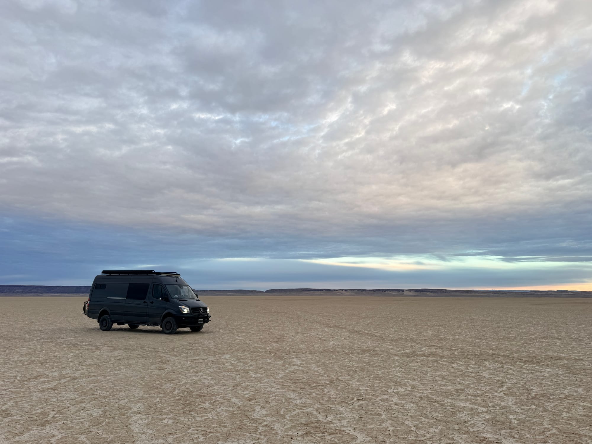 At Pike Creek I stopped and did the Pike Creek trail hike. It was a very nice hike. roughly 3.2 miles in and out, with 1,500 feet of elevation gain. It took me just over 5 hours to complete, which put a bit behind on my schedule, but I think that is fine. I got back to the van at around 3:30. and then headed for the frog spring access to the Alvord dessert. I was fortunate that it was dry and hard, so I was able to drive out onto the dry lake bed, which was kind of cool. I used this as an opportunity to get some Glamour shots of the van in middle of the lake bed, with the mountains in the background.