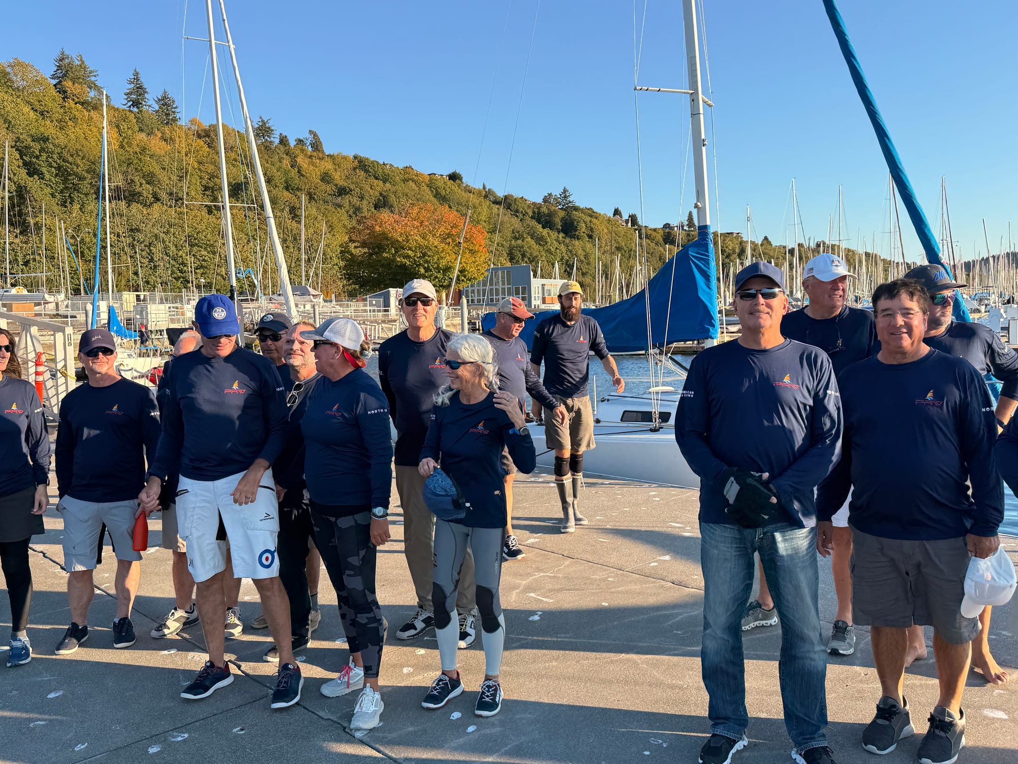 The day ended with us all lining up on X dock in front of the boats in the dying light, and KB getting a picture of us all in our course shirts.