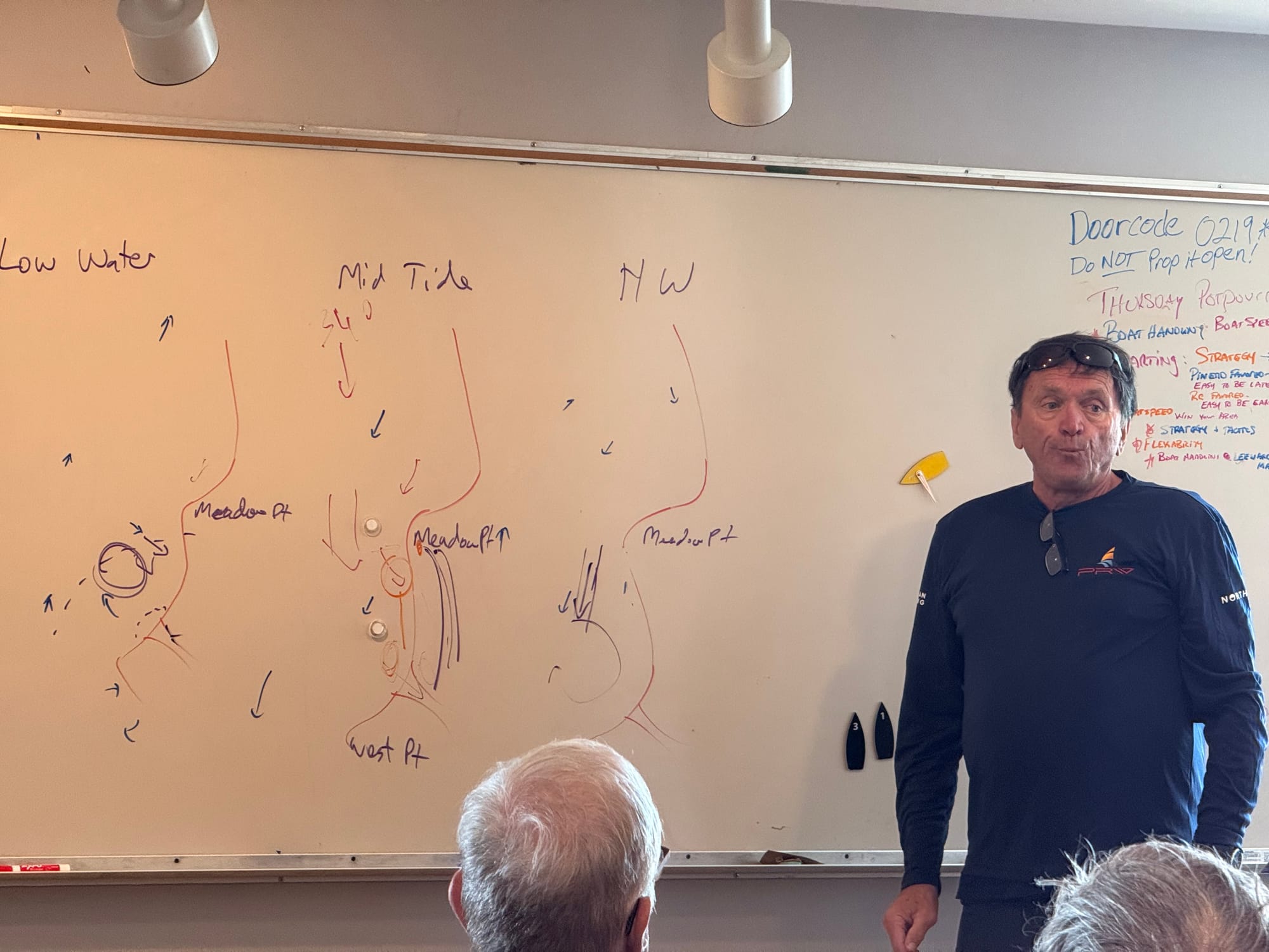 What another beautiful day in the Northwest. Thursday brought a bit more breeze, and we made the most of it. We started in the classroom, unpacking lessons from the day before and digging deeper into tactics. The focus was on starts, mark roundings, and especially how to defend the right or left side of the course. A big theme was fleet awareness: it’s easy to get locked into a one-on-one duel, only to look up and realize the rest of the fleet has gone to the favored side. Beating one boat doesn’t mean much if ten others just sailed around you. The constant reminder was simple but true—boat speed is your best friend in all conditions.