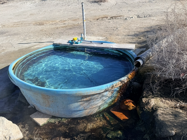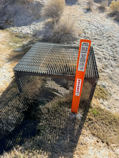My first big stop was a detour down a washboard road toward a hot spring. I made it about a hundred yards before realizing I needed to air down, and once I did, the ride was much smoother. The spring itself was enclosed in a wire cage, feeding warm water through a pipe into a bright blue 10-foot-diameter pool. It looked inviting, but I decided not to climb in.