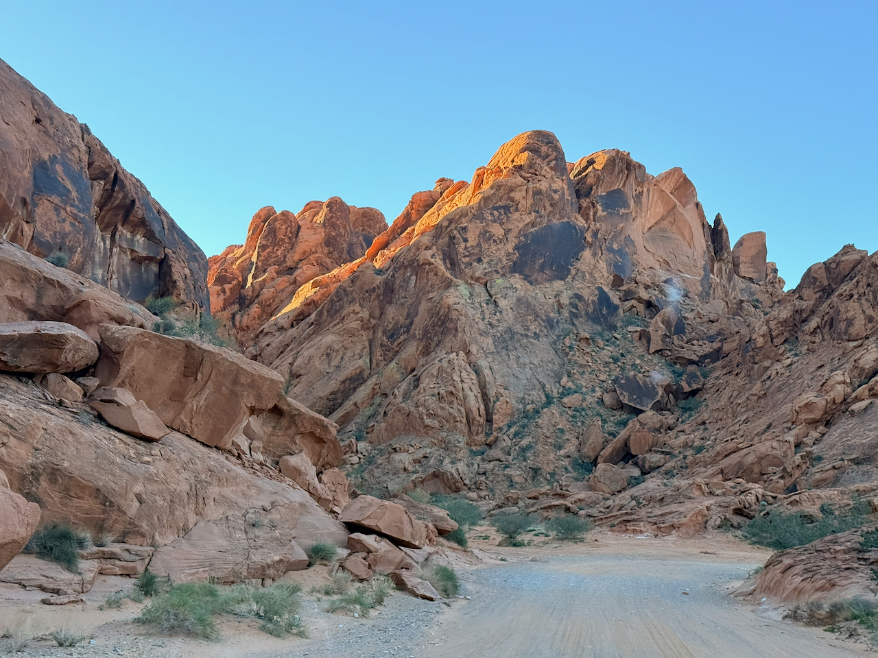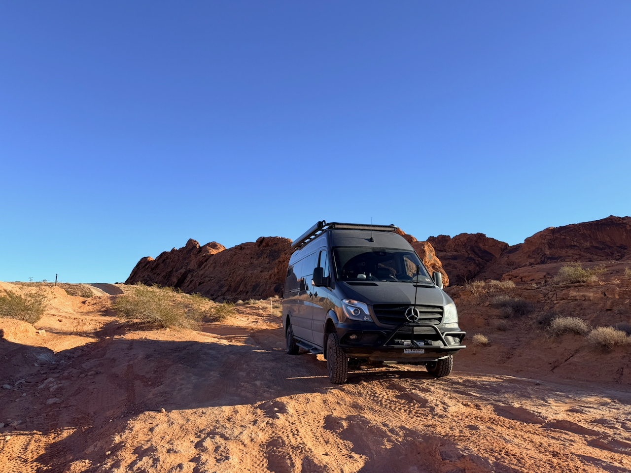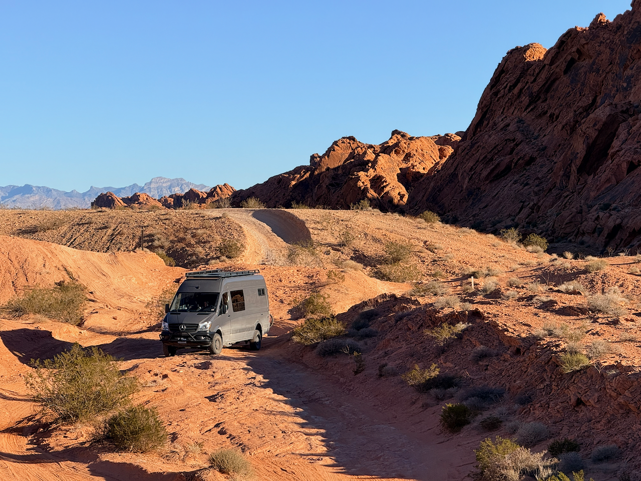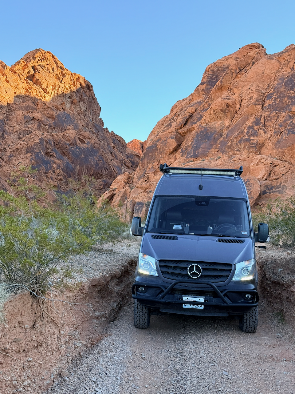 That was a rough trail... But the van handled it super well. I decided to traverse the road in two-wheel drive to see how far I could get before I had to turn around, and I was very pleased with how many obstacles and how much terrain the van could handle. There were a couple of places that were pretty sketchy, one in particular, and I decided to go around. This all went well until I arrived at the exit of the Overton Wash. This was an obstacle that I couldn't figure out how to get around. I searched all of the different lines around there. Looked for a way around the slick rock I had to crawl up, but couldn't find one. So I made a calculated decision to airdown my tires, stick it into four low, and see if I could take the path that, based on the tracks, was the only way up and forward.
